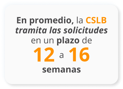 El tiempo de tramitación de una solicitud de licencia de contratista en California puede variar en función de varios factores, como el volumen de solicitudes recibidas y lo completa que esté tu solicitud. Por término medio, la CSLB pretende tramitar las solicitudes en un plazo de 12 a 16 semanas.