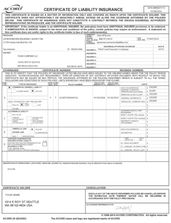 - Contrata un seguro de responsabilidad civil general con una cobertura mínima de 50.000 $ por daños materiales y 200.000 $ por responsabilidad civil, o una póliza de límite único combinado de 250.000 $.