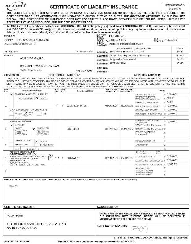 - Requisito: Todos los contratistas de Nevada deben tener un seguro de responsabilidad civil general como requisito para obtener una licencia de contratista en Nevada. Este seguro brinda cobertura contra reclamos por daños a la propiedad, lesiones corporales o lesiones personales que pudieran ocurrir.